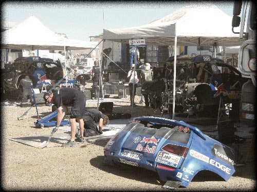 Given the fact that the Volkswagen team has been winning the last few years, the drivers are totally pampered. They don't have to do anything except drive - at the end of their racing day a team of mechanics descend on the cars and tear them completely apart. Each car has its own support truck, and team of mechanics. The driver of each vehicle sits down with the chief mechanic and explains any details that he thinks the mechanics need to know about and he is "off the clock". He then goes for a massage, has dinner and goes to sleep in the air-conditioned bunk of the support truck. Not bad… The picture above is from the Volkswagen "compound" ... this is "Big Bucks racing at Dakar"